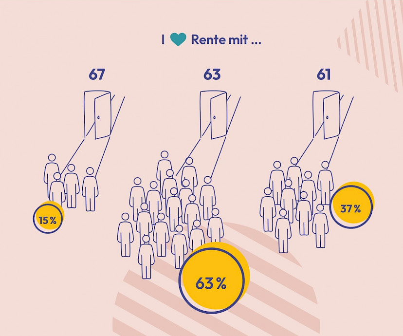 Zur ArtikelserieDie Ergebnisse der Umfrage im Jahr 2023 des Marktforschungsinstituts Civey im Auftrag des Demographie Netzwerks e.V. (ddn) zeigen, dass eine große Mehrheit der Erwerbstätigen in Deutschland sich wünscht, spätestens mit 63 Jahren in Rente gehen zu können.