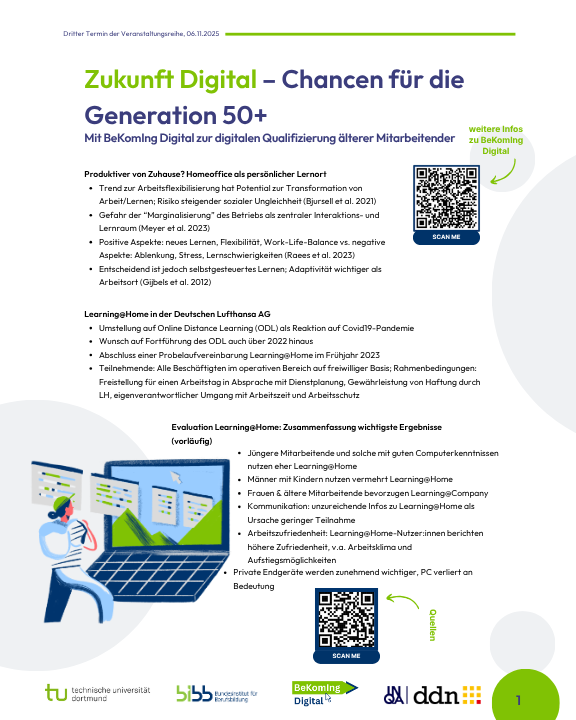 Die Veranstaltungsreihe zeigte eindrucksvoll, wie digitale Weiterbildung zukunftsfähig gestaltet werden kann – wenn sie an den Bedürfnissen der Beschäftigten ausgerichtet ist. Insgesamt wurde deutlich, dass ältere und jüngere Beschäftigte ähnliche Lerninhalte bevorzugen, ältere Beschäftigte jedoch stärker sozialen Austausch bevorzugen. Deshalb sollten digitale Lernformate gezielt Möglichkeiten für Interaktion und Rückfragen bieten.