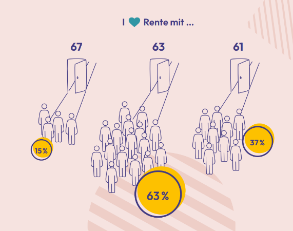 Interessanterweise zeigt sich auch bei den jüngeren Erwerbstätigen eine Skepsis gegenüber einem langen Arbeitsleben. Nur knapp 15% der Befragten unter 30 Jahren können sich vorstellen, bis zum gesetzlichen Renteneintrittsalter von 67 Jahren zu arbeiten. Diese Zahlen deuten darauf hin, dass die Vorstellung eines längeren Arbeitslebens nicht allgemein populär ist und viele Menschen eher einen frühen Ruhestand anstreben.