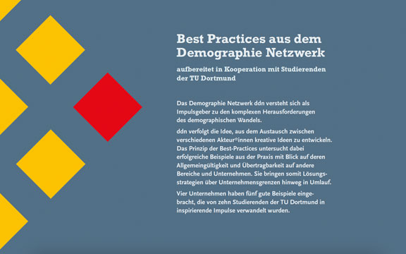 Studierende der TU Dortmund haben unter der Federführung von Dr. Jonathan Falkenberg, Heisenberg-Professur für Arbeits- und Organisationssoziologie, wegweisende Praxisbeispiele von Unternehmen des Demographie Netzwerks zu Impulsen aufbereitet, die wir Ihnen gern nacheinander vorstellen möchten. Die Best-Practices aus heterogenen Anwendungsfeldern bilden ein vielfältiges Themenspektrum, welches sich in zahlreichen Aktivitäten des Netzwerks widerspiegelt, ab, und haben daher einen hohen inhaltlichen Mehrwert.