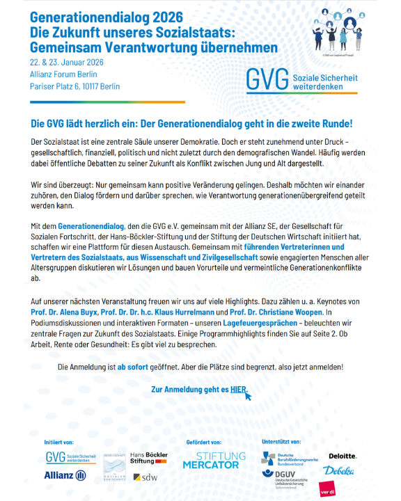 Mit dem Generationendialog, den die GVG e.V. gemeinsam mit der Allianz SE, der Gesellschaft für Sozialen Fortschritt, der Hans- Böckler-Stiftung und der Stiftung der Deutschen Wirtschaft initiiert hat, wird eine Plattform für diesen Austausch geschaffen. Gemeinsam mit führenden Vertreterinnen und Vertretern des Sozialstaats, aus Wissenschaft und Zivilgesellschaft sowie engagierten Menschen aller Altersgruppen werden Lösungen diskutiert und Vorurteile und vermeintliche Generationenkonflikte abgebaut.